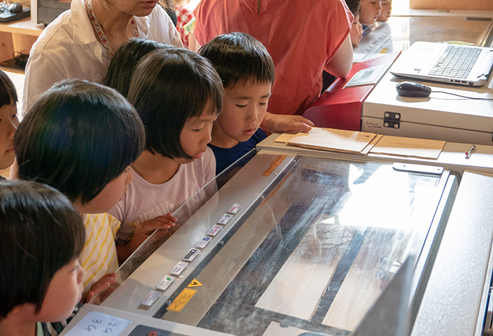 レーザー加工を見学。どの子も真剣な表情!歓声があがりました。