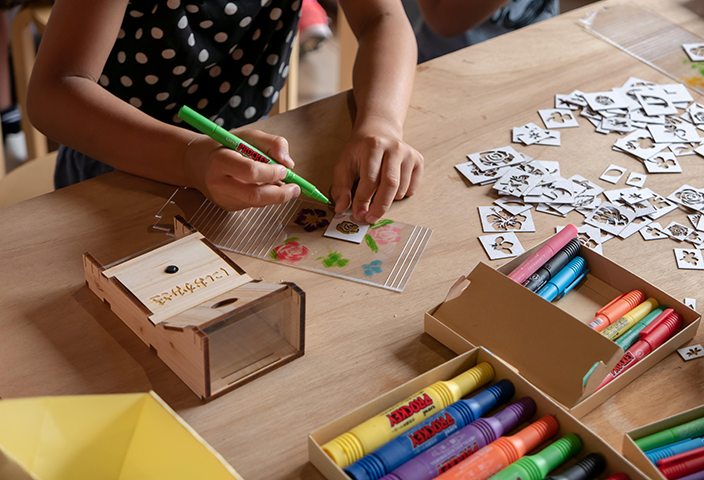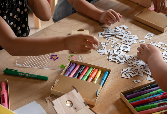 子どもたちが使っているステンシルもレーザーカッターで加工したパーツ。今回使用した厚紙など、レーザーカッターは紙の加工もできるのです。